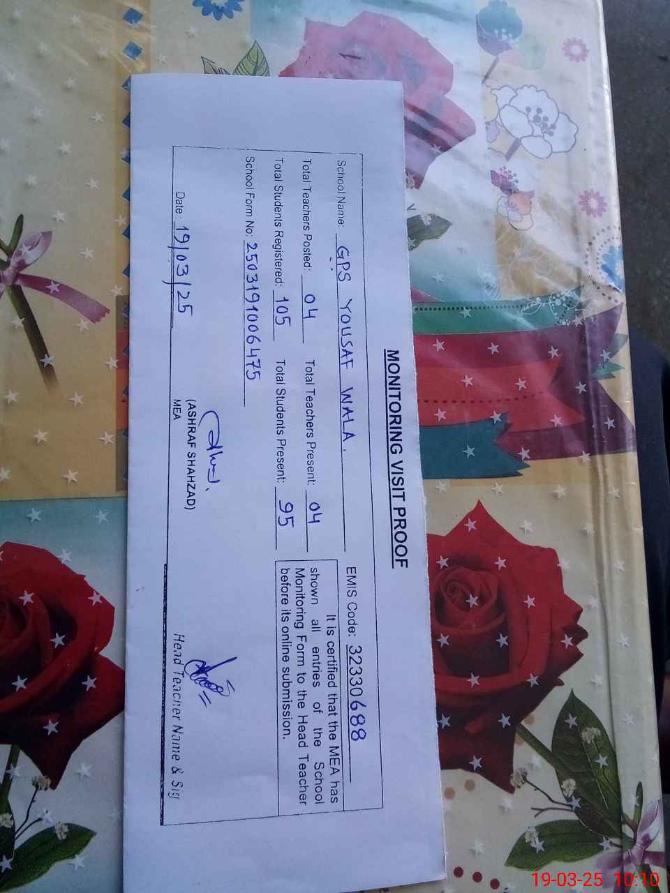 | Attendance Register | Head Teacher | MEA with School | Visit Proof |