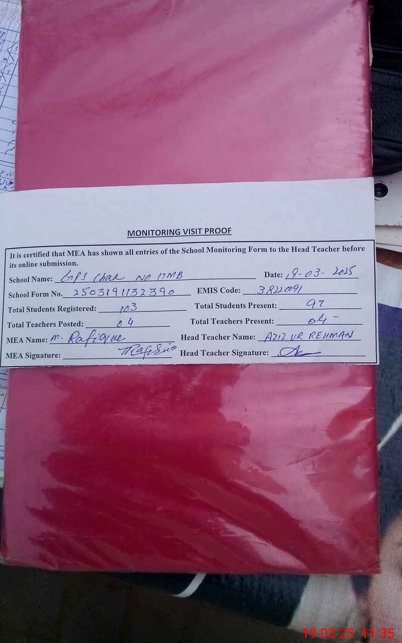 | EMIS Code: 38220091 | Name of School: GPS CHAK NO. 17/MB | |||