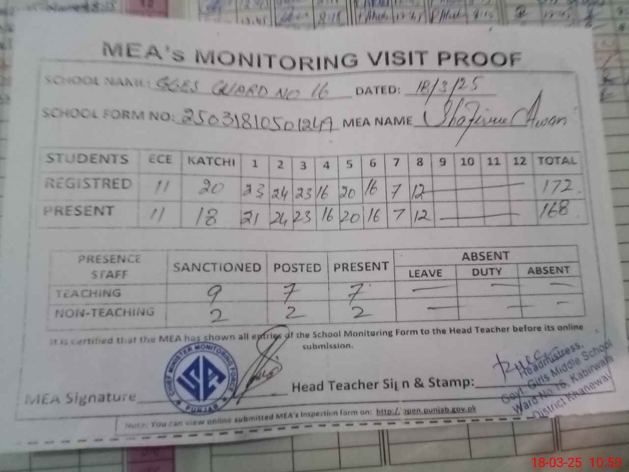 | EMIS Code: 36410332 | Name of School: GGES WARD NO.16 KABIRWALA | |||