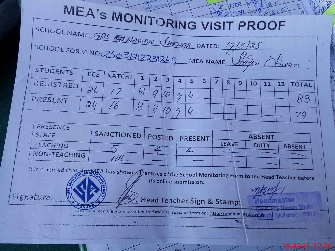 | EMIS Code: 36410515 | Name of School: GPS NAWAN SHEHR GHARBI, KABIRWALA | |||