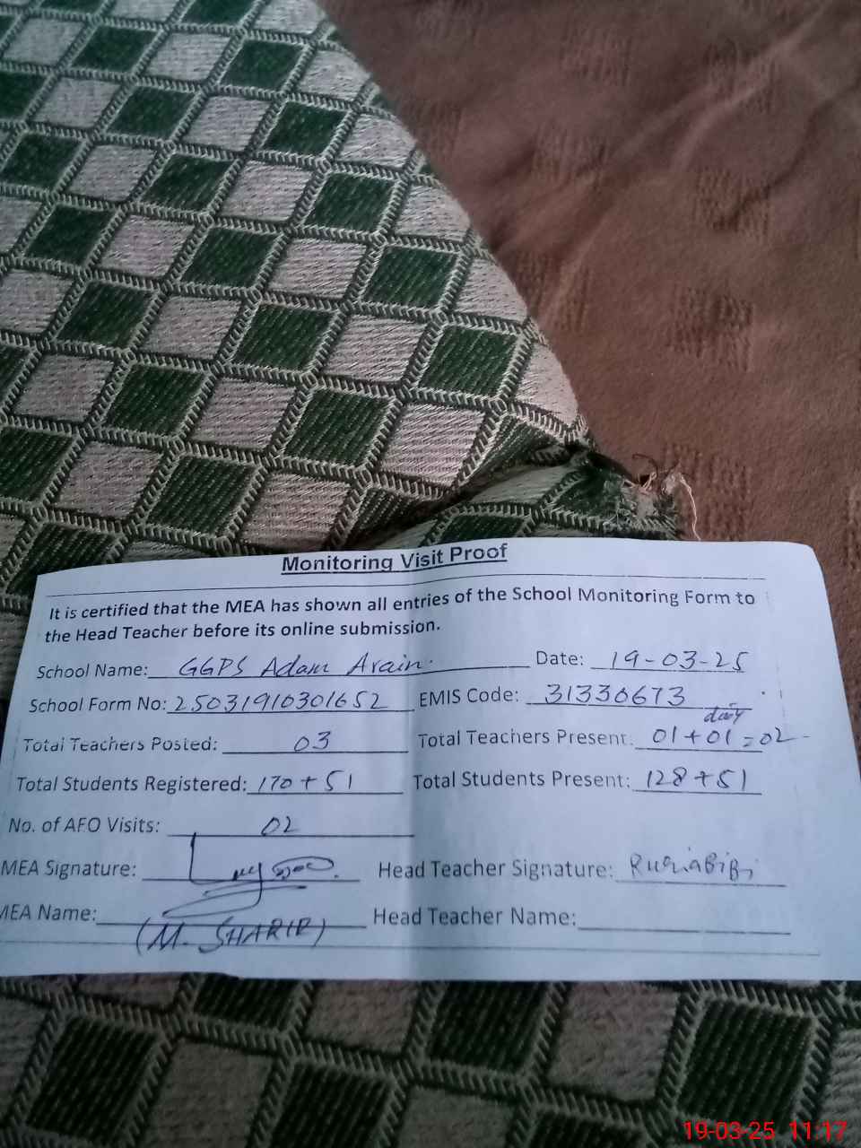 | EMIS Code: 31330673 | Name of School: GGPS ADAM ARAIN | |||