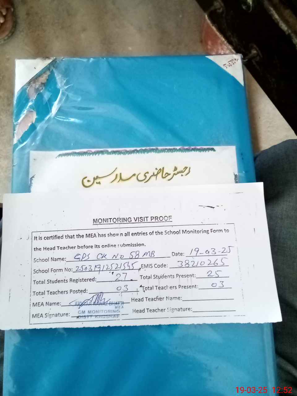| EMIS Code: 38210265 | Name of School: GPS CHAK NO. 58 MB | |||