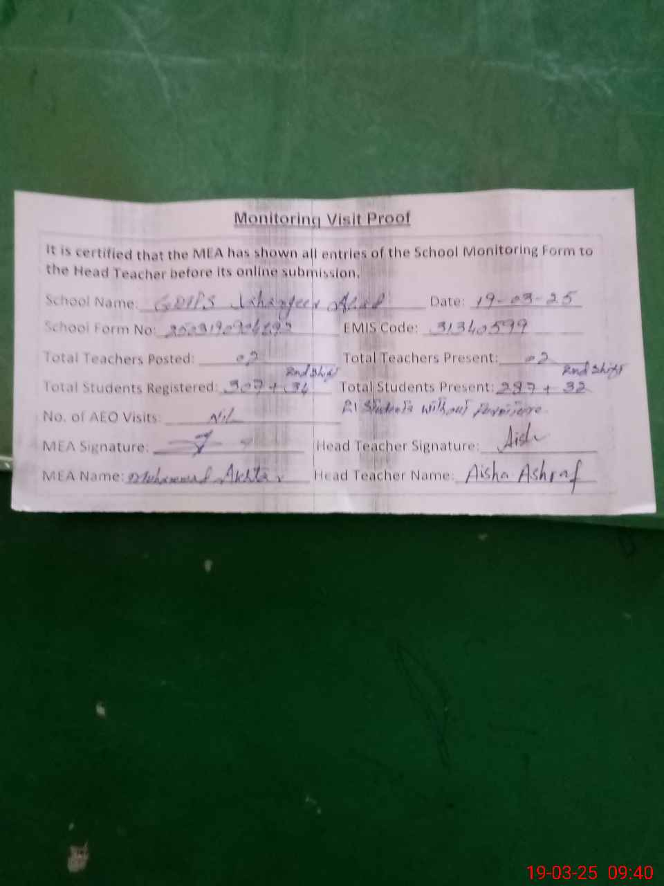 | Attendance Register | Head Teacher | MEA with School | Visit Proof |