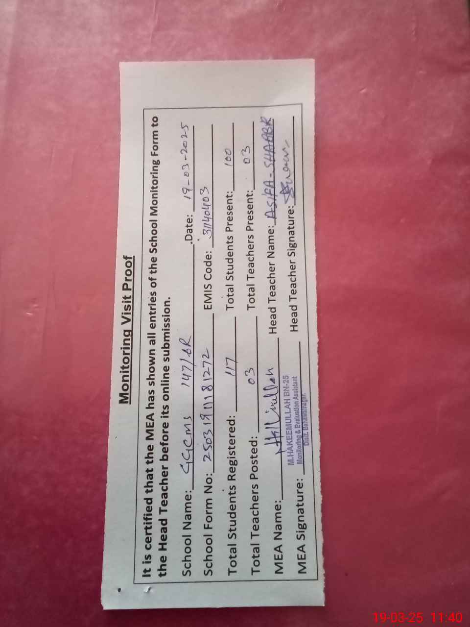 | Attendance Register | Head Teacher | MEA with School | Visit Proof |