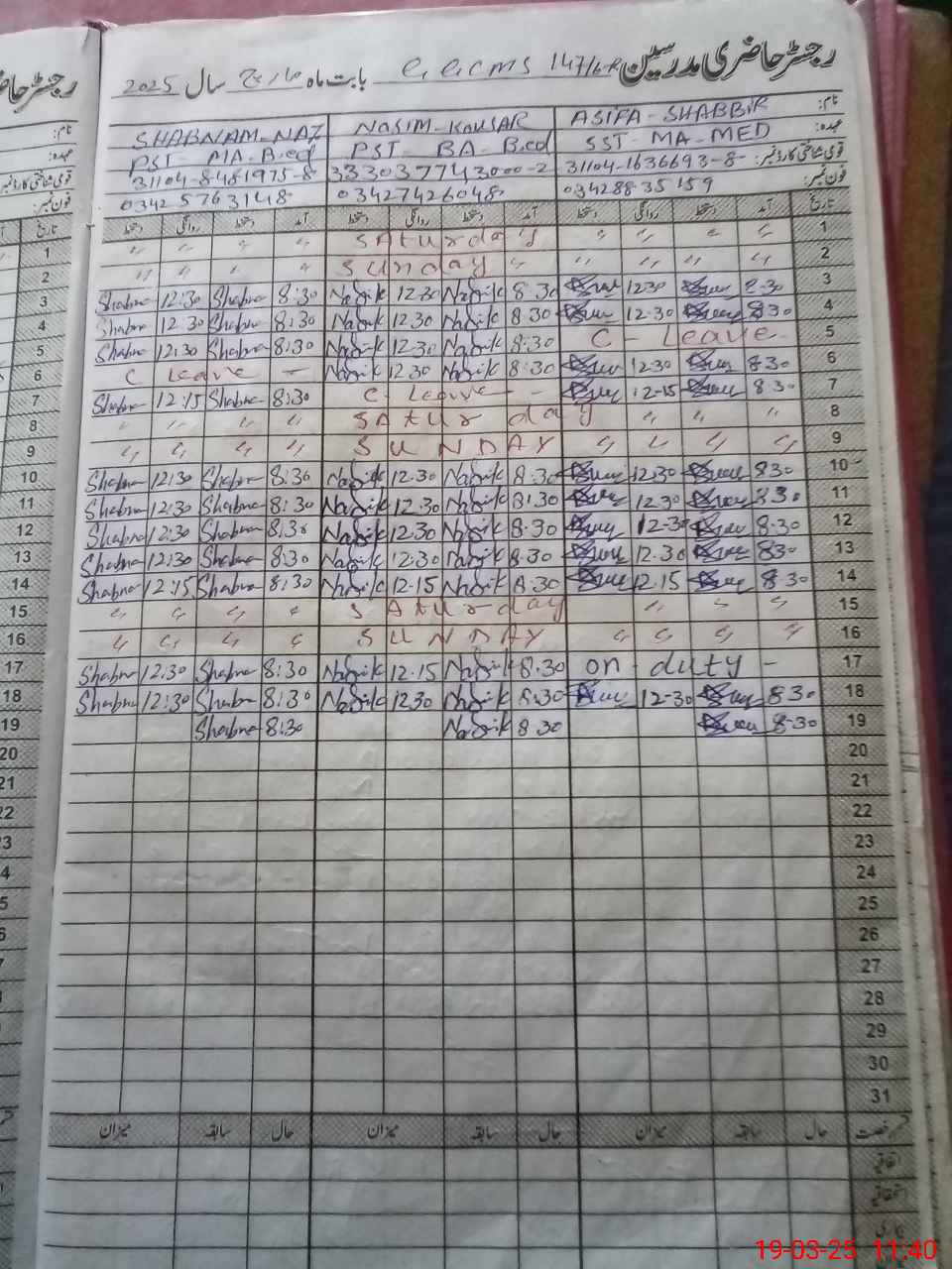 | CNIC | Full Name | Designation | R/C | Absence During Last Calender Month |