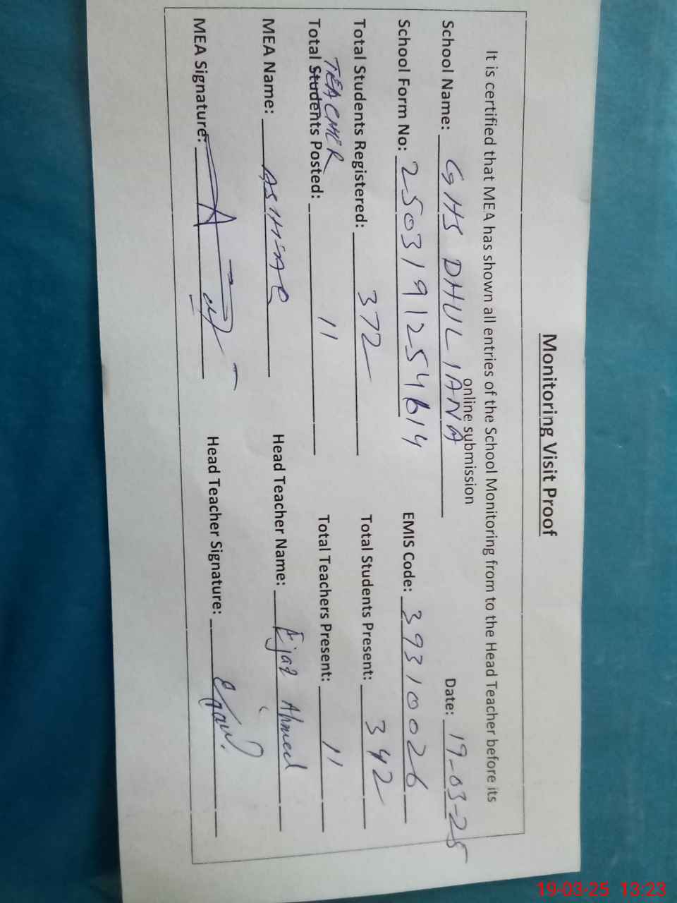| EMIS Code: 39310026 | Name of School: GHS DHULIANA | |||