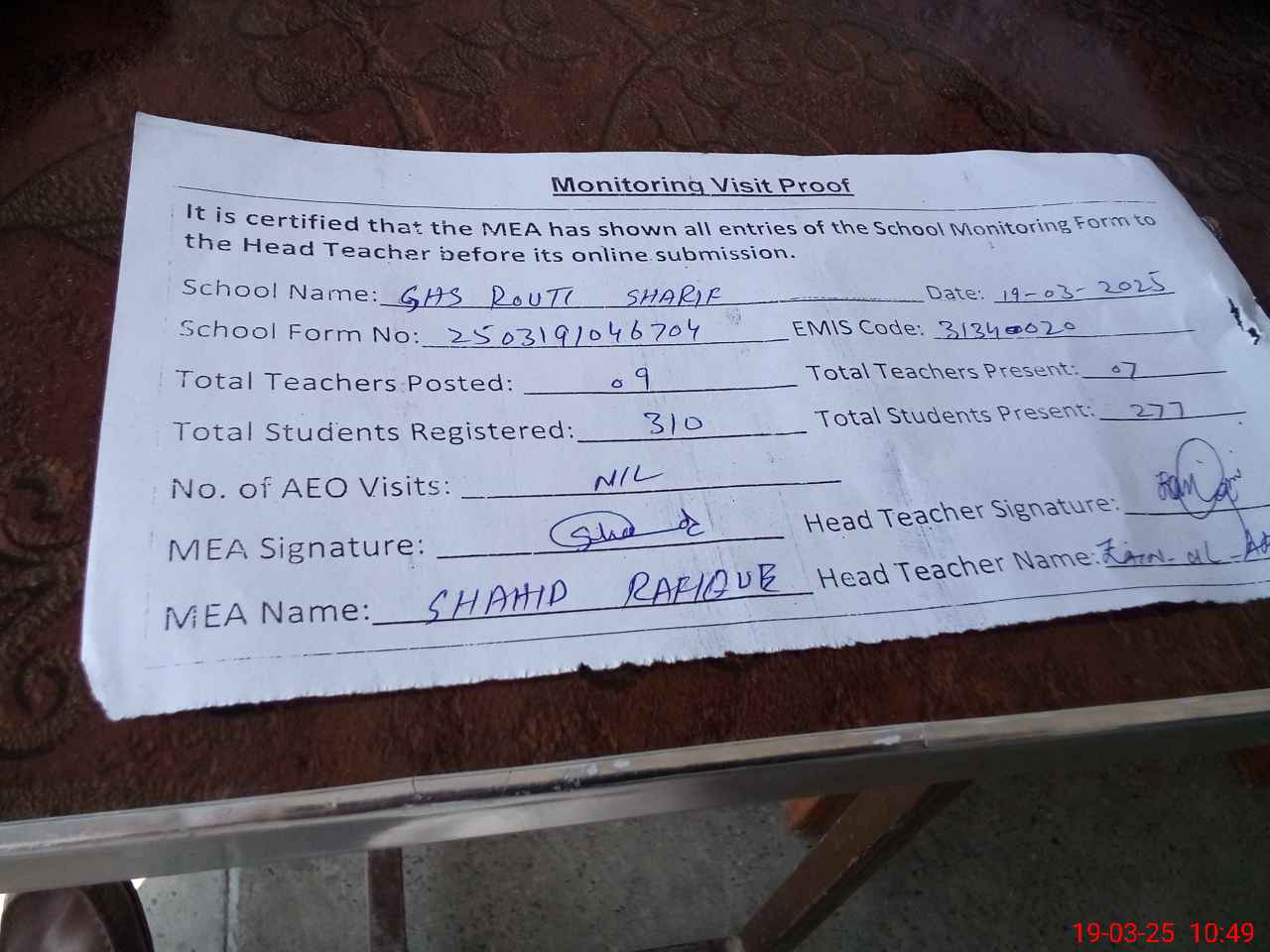 | Certified that this School was Inspected by the Undersigned MEA/DMO Today and the Information Stated Above is as Per Record. | |||||