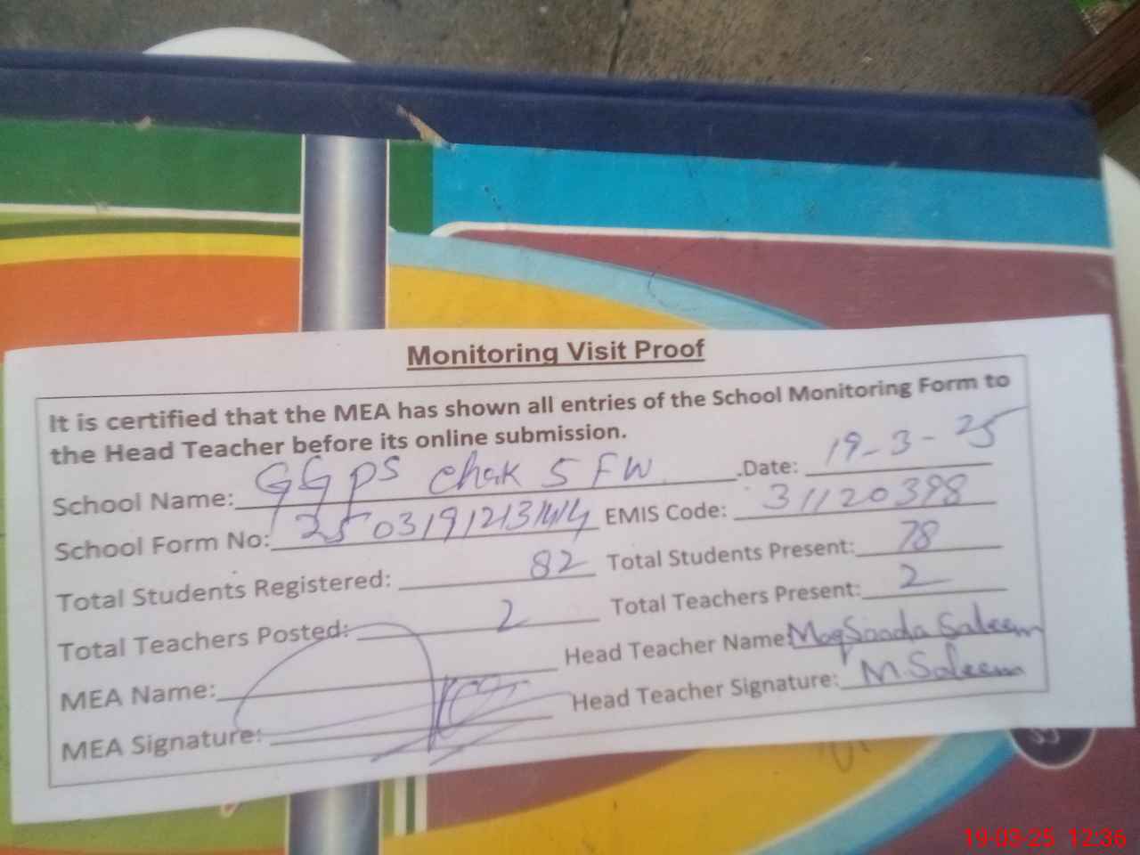 | EMIS Code: 31120398 | Name of School: GGPS CHAK 5/FW BASTI TALIB WALI | |||