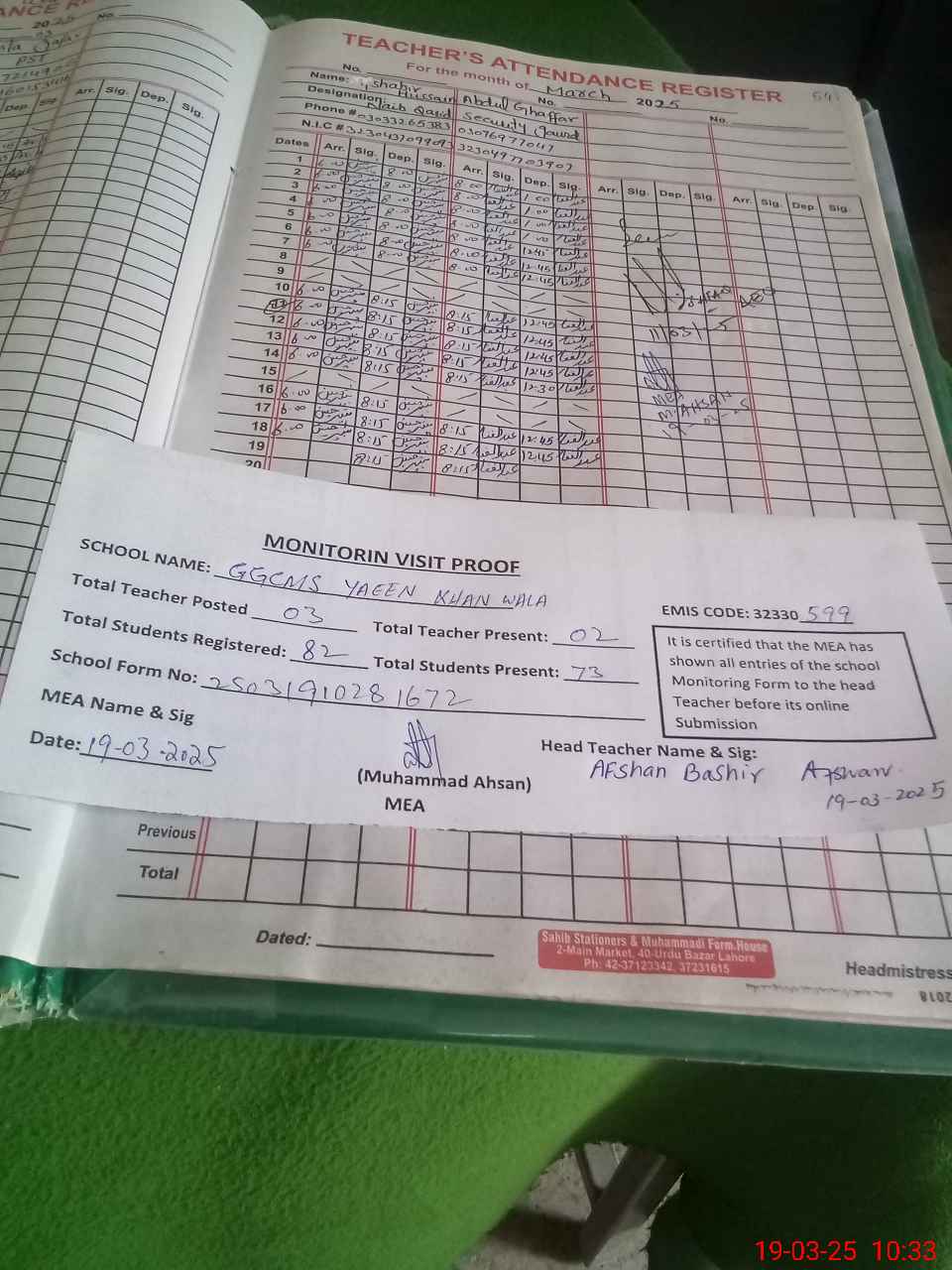 | Attendance Register | Head Teacher | MEA with School | Visit Proof |