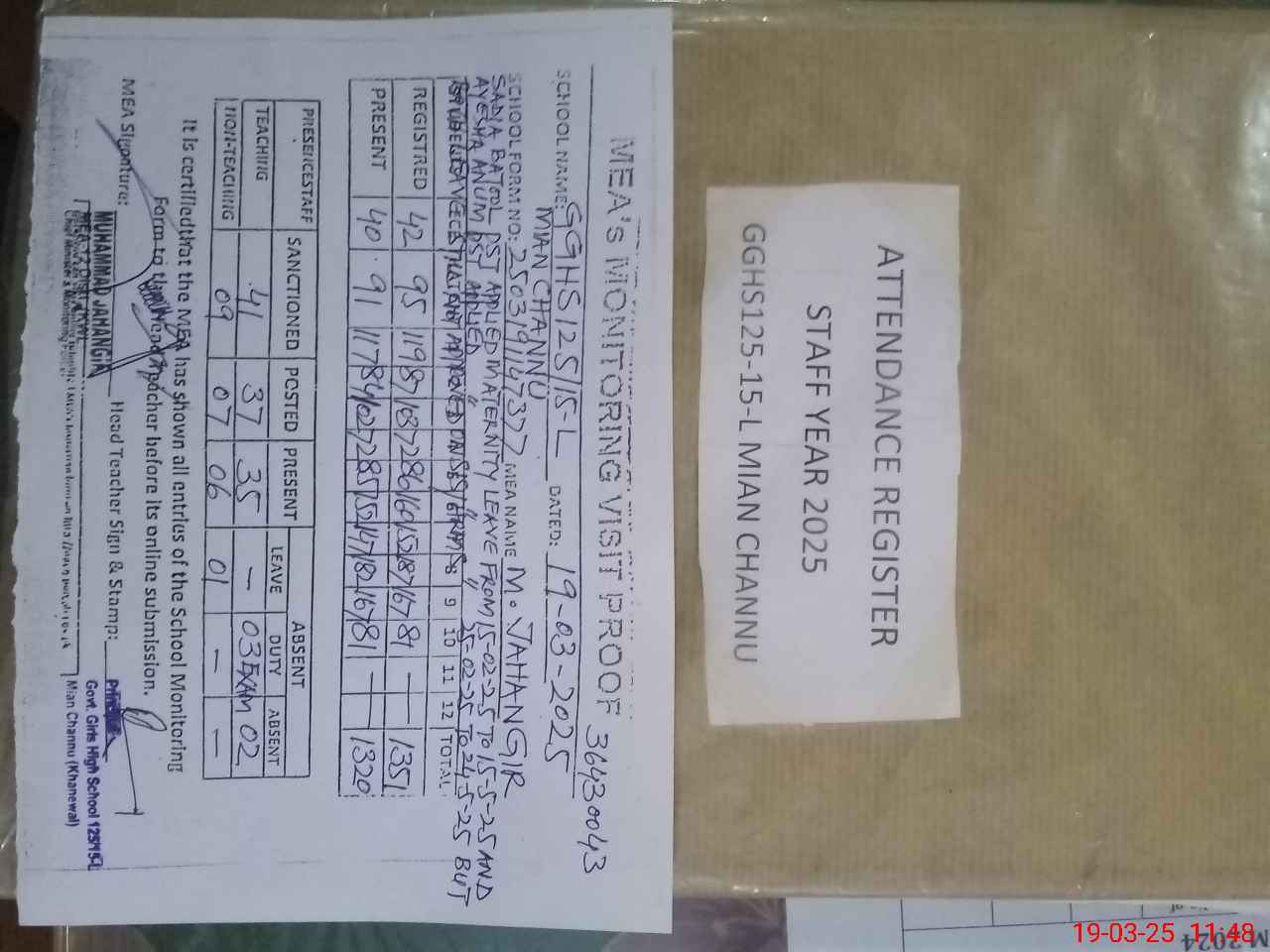 | Attendance Register | Head Teacher | MEA with School | Visit Proof |