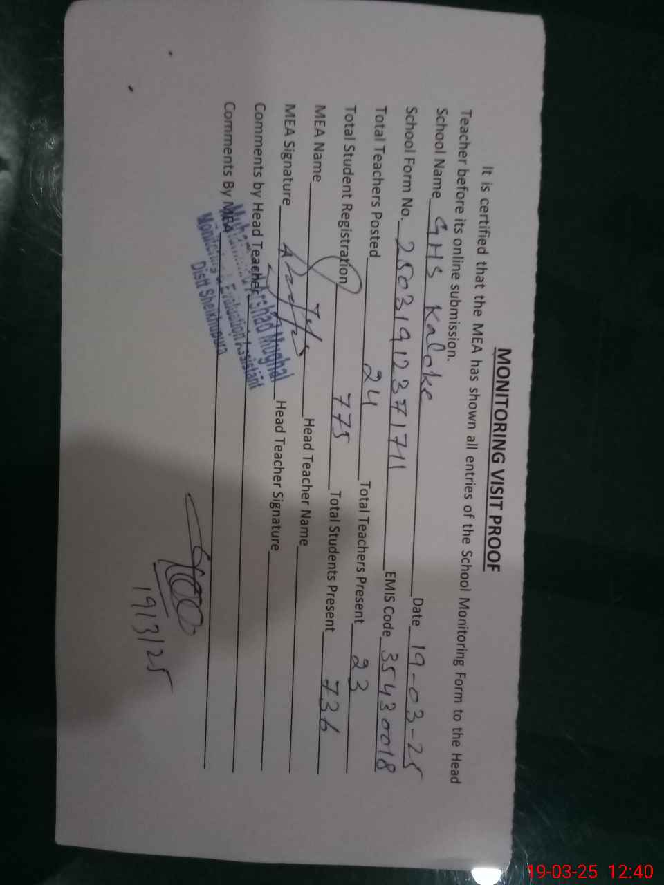 | Attendance Register | Head Teacher | MEA with School | Visit Proof |