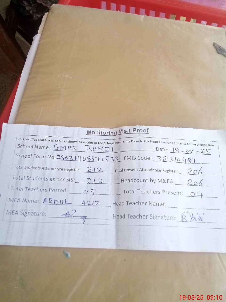 | Attendance Register | Head Teacher | MEA with School | Visit Proof |