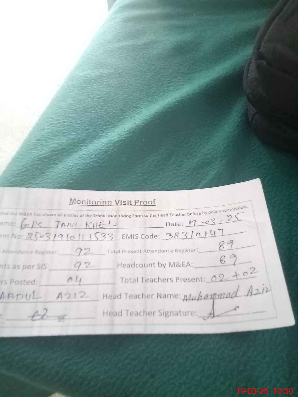 | Attendance Register | Head Teacher | MEA with School | Visit Proof |