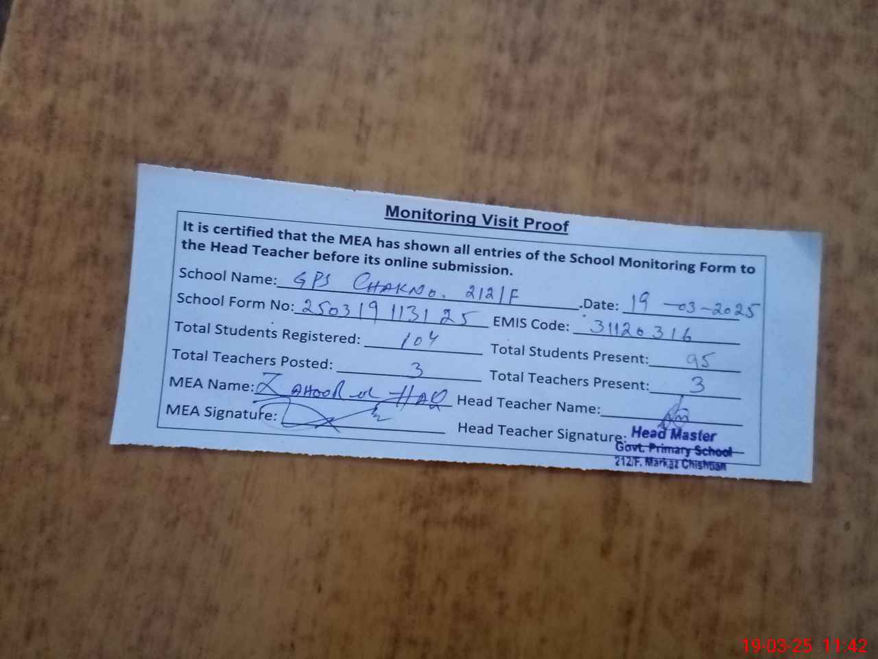 | Attendance Register | Head Teacher | MEA with School | Visit Proof |