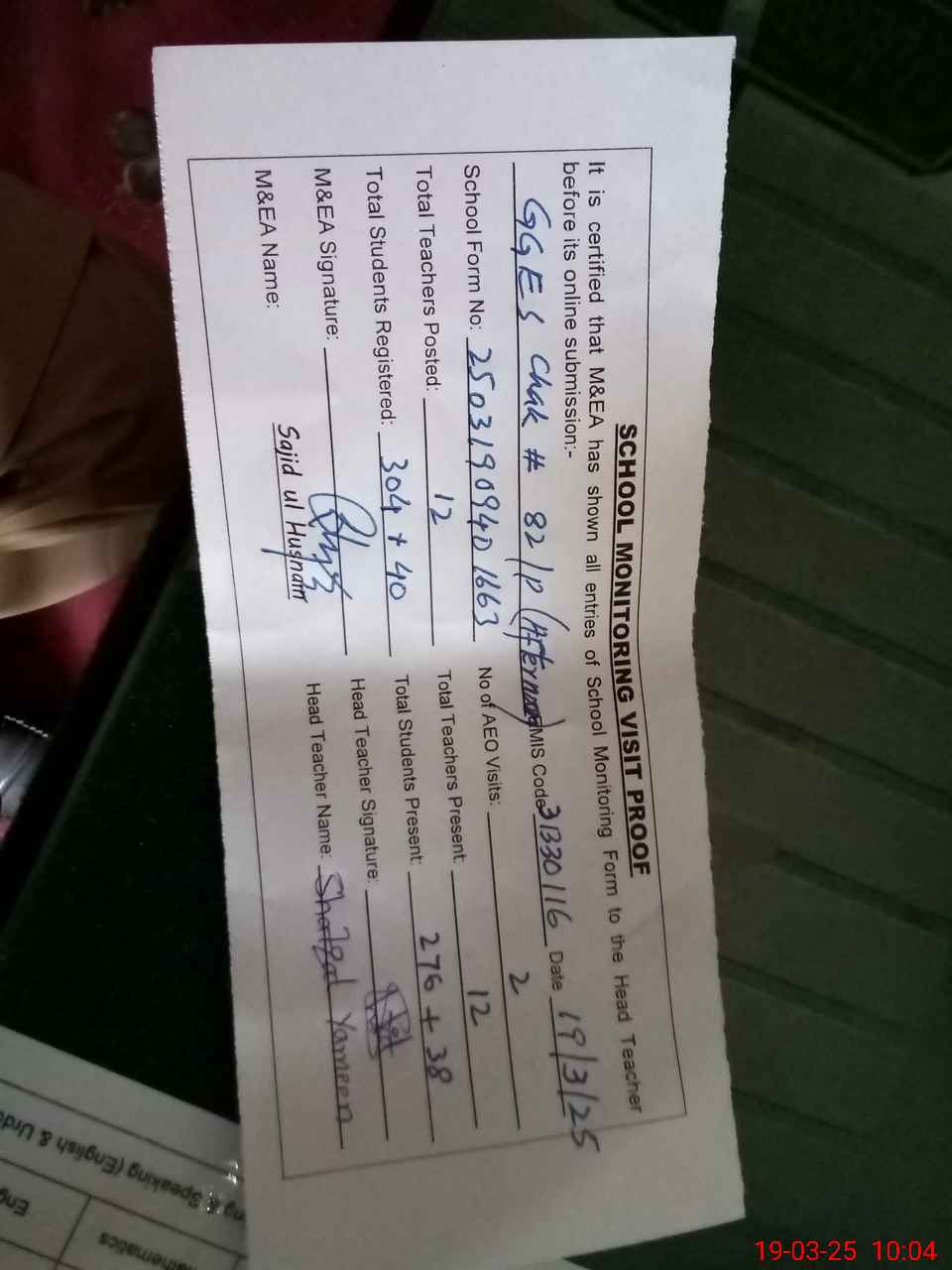 | Attendance Register | Head Teacher | MEA with School | Visit Proof |