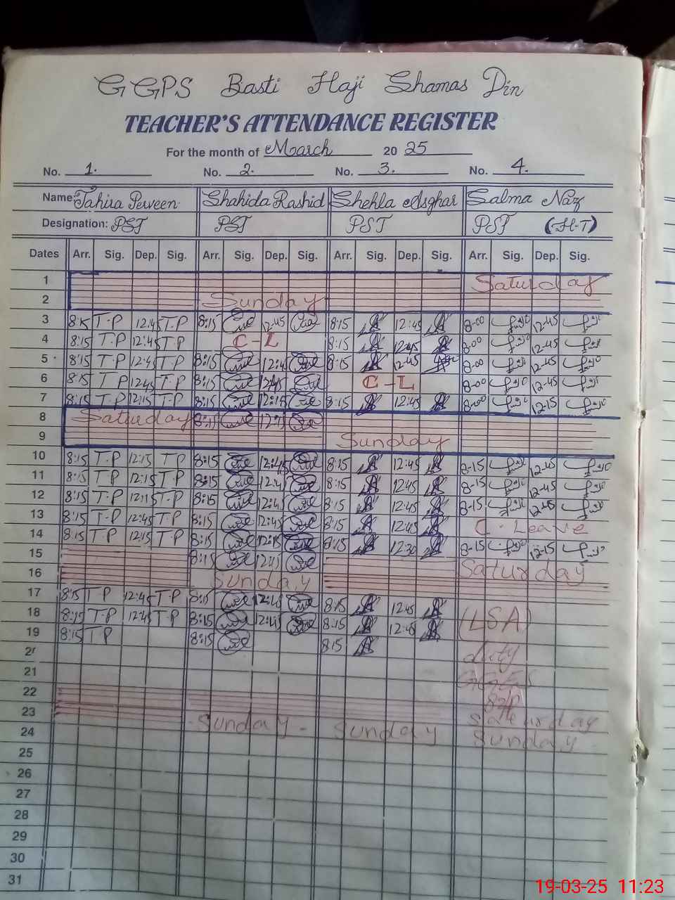 | 42**** | Sa**** Na**** | PST | Regular | 0 | 0 | 0 | 0 | 0 | 0 | 0 | 0 | 0 | Exam Duty |
