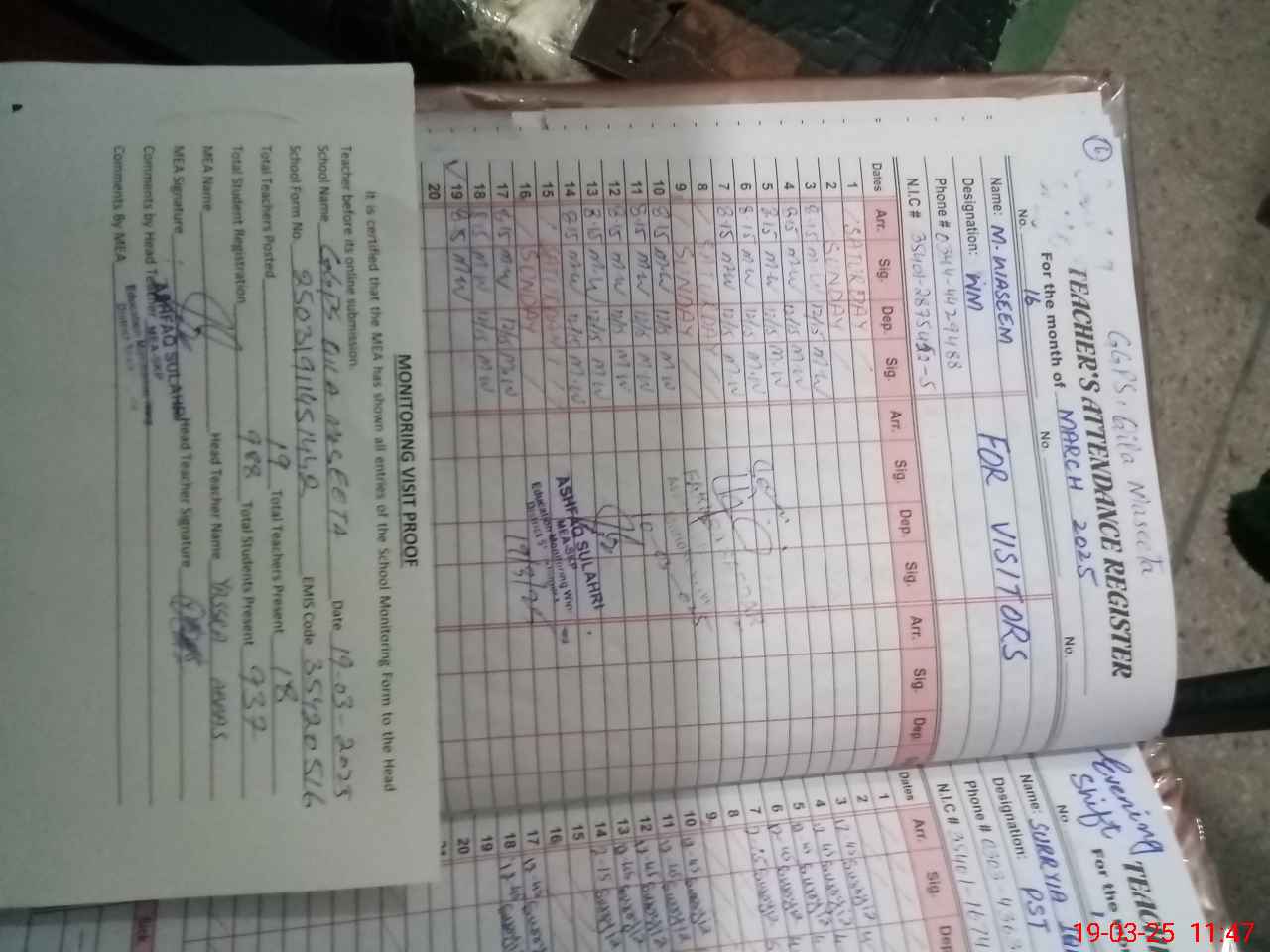 | Attendance Register | Head Teacher | MEA with School | Visit Proof |