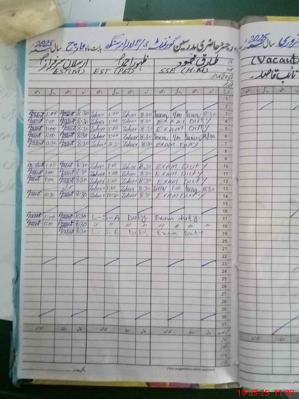 | 31**** | Ah**** Ra**** | EST(GENERAL) | Temporary | 0 | 0 | 0 | 0 | 0 | 0 | 0 | 0 | 0 | Exam Duty |