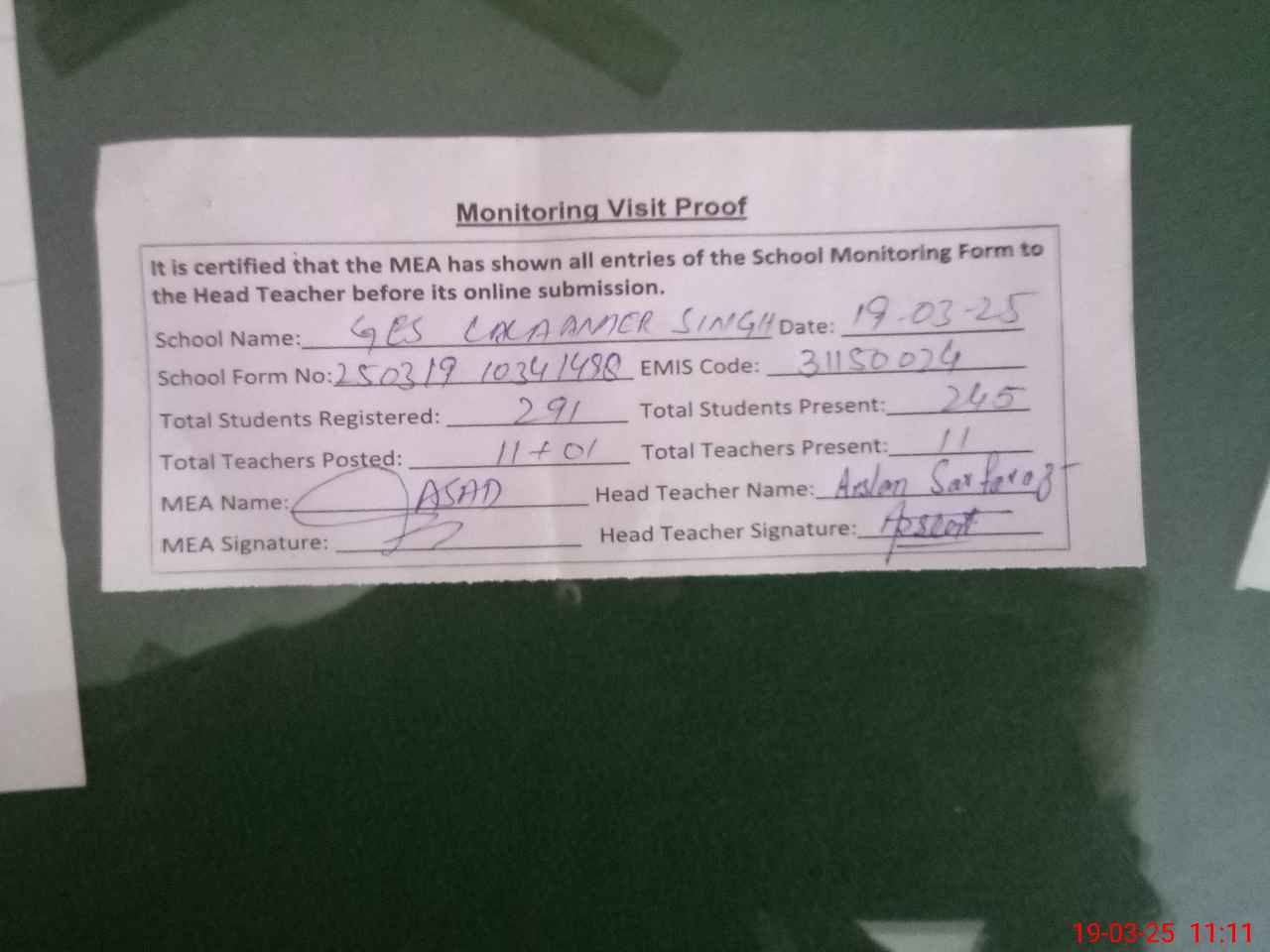 | Attendance Register | Head Teacher | MEA with School | Visit Proof |