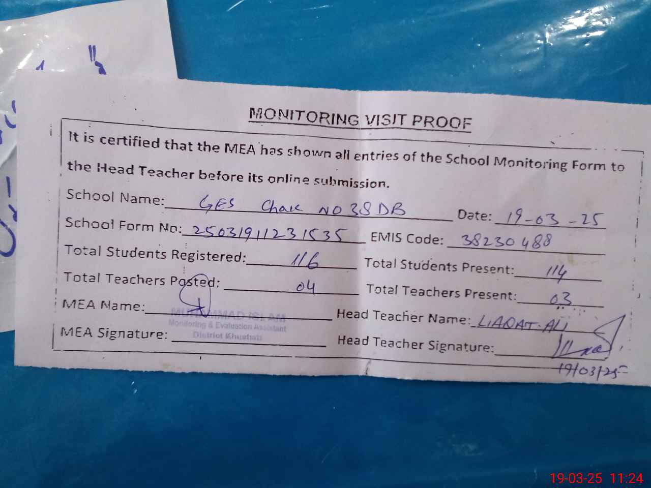 | EMIS Code: 38230488 | Name of School: GES CHAK NO. 38 DB | |||