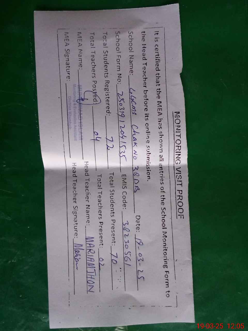 | Attendance Register | Head Teacher | MEA with School | Visit Proof |