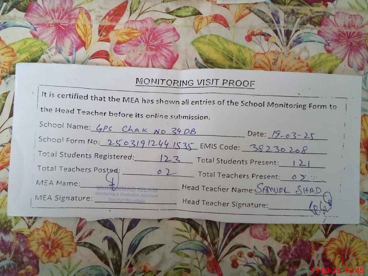 | EMIS Code: 38230208 | Name of School: GPS CHAK NO. 34/DB | |||