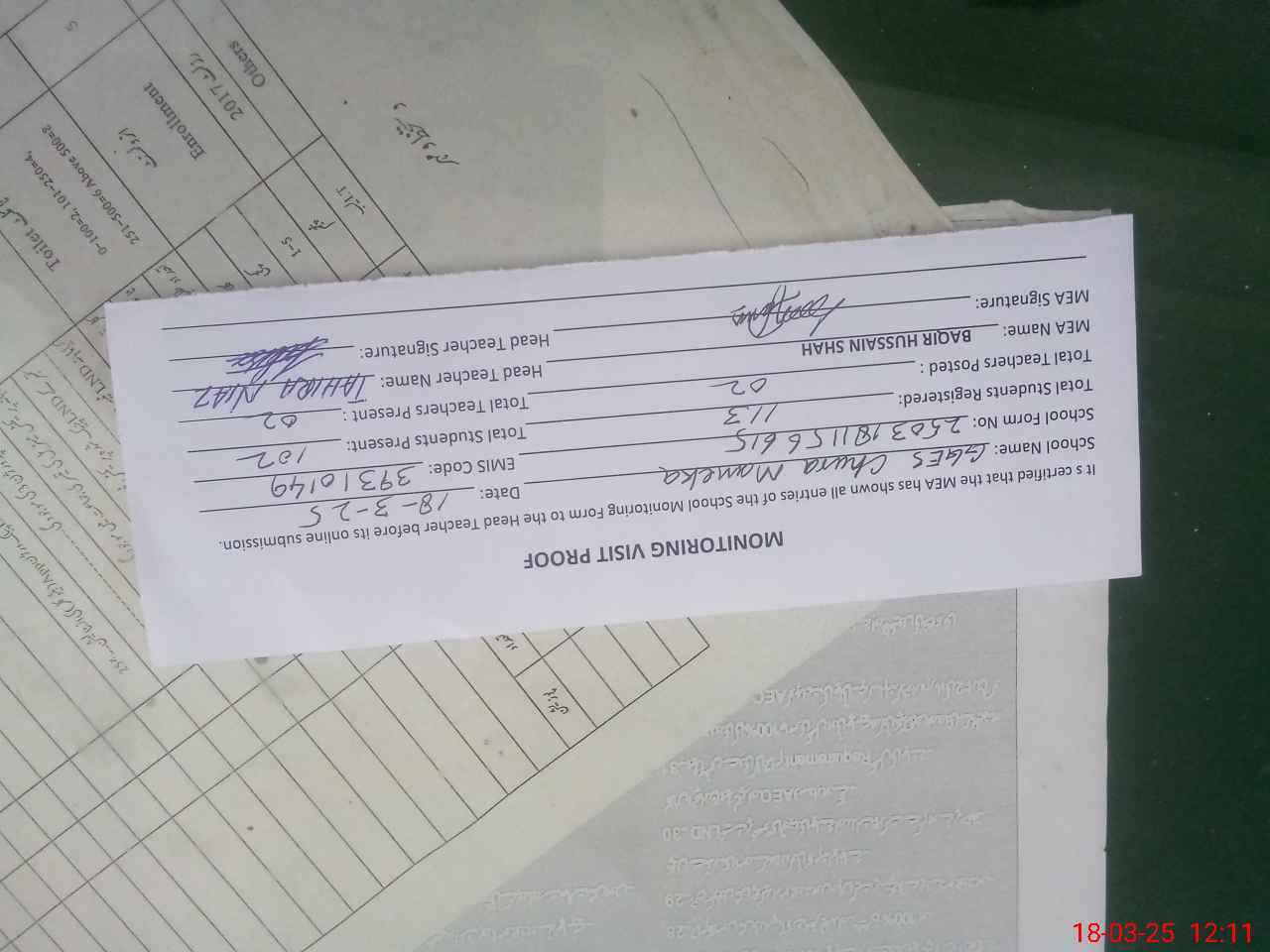 | Attendance Register | Head Teacher | MEA with School | Visit Proof |