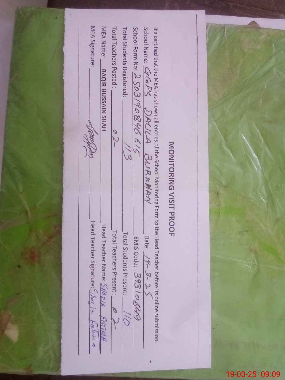 | Attendance Register | Head Teacher | MEA with School | Visit Proof |