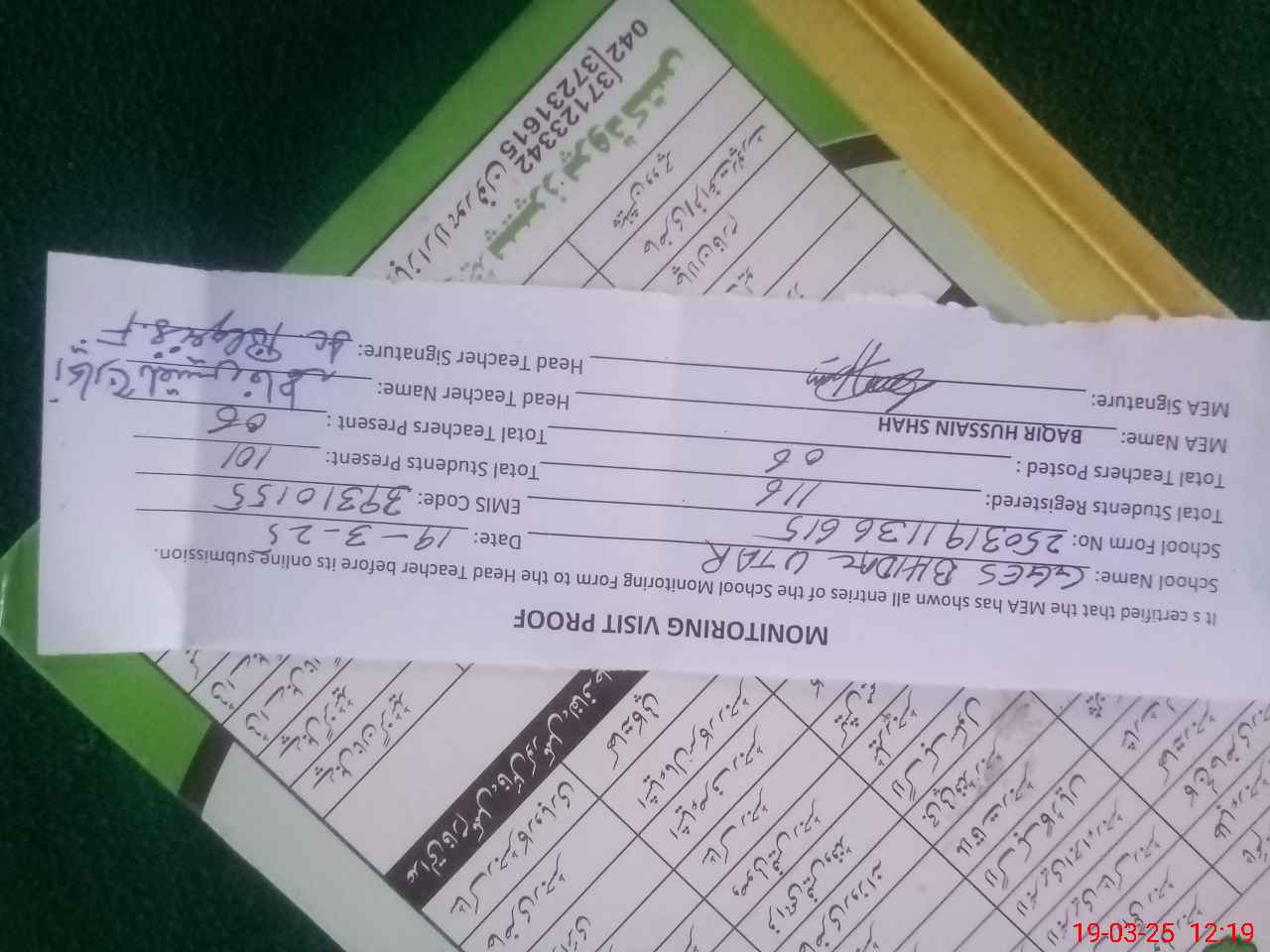 | Certified that this School was Inspected by the Undersigned MEA/DMO Today and the Information Stated Above is as Per Record. | |||||