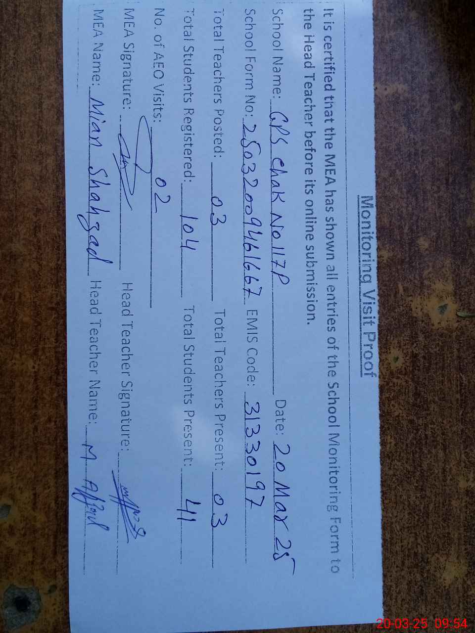 | Attendance Register | Head Teacher | MEA with School | Visit Proof |