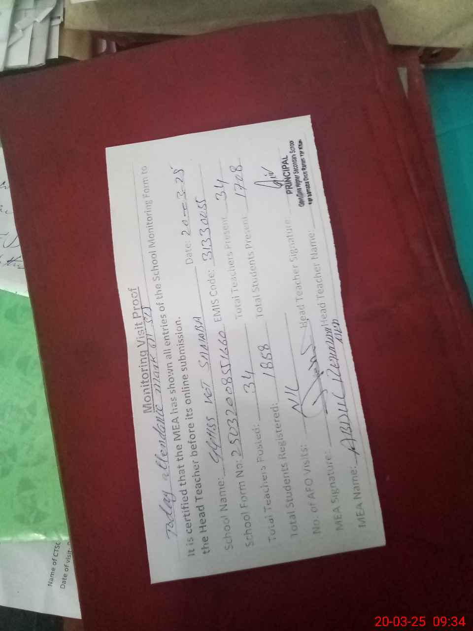 | Attendance Register | Head Teacher | MEA with School | Visit Proof |