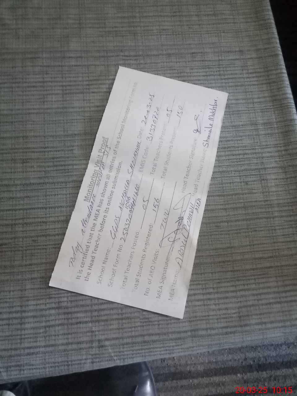 | Attendance Register | Head Teacher | MEA with School | Visit Proof |