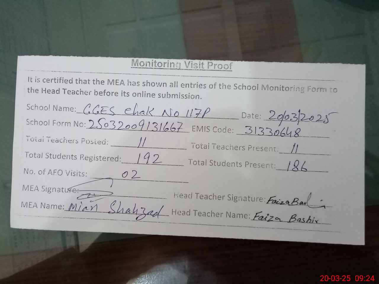 | Attendance Register | Head Teacher | MEA with School | Visit Proof |