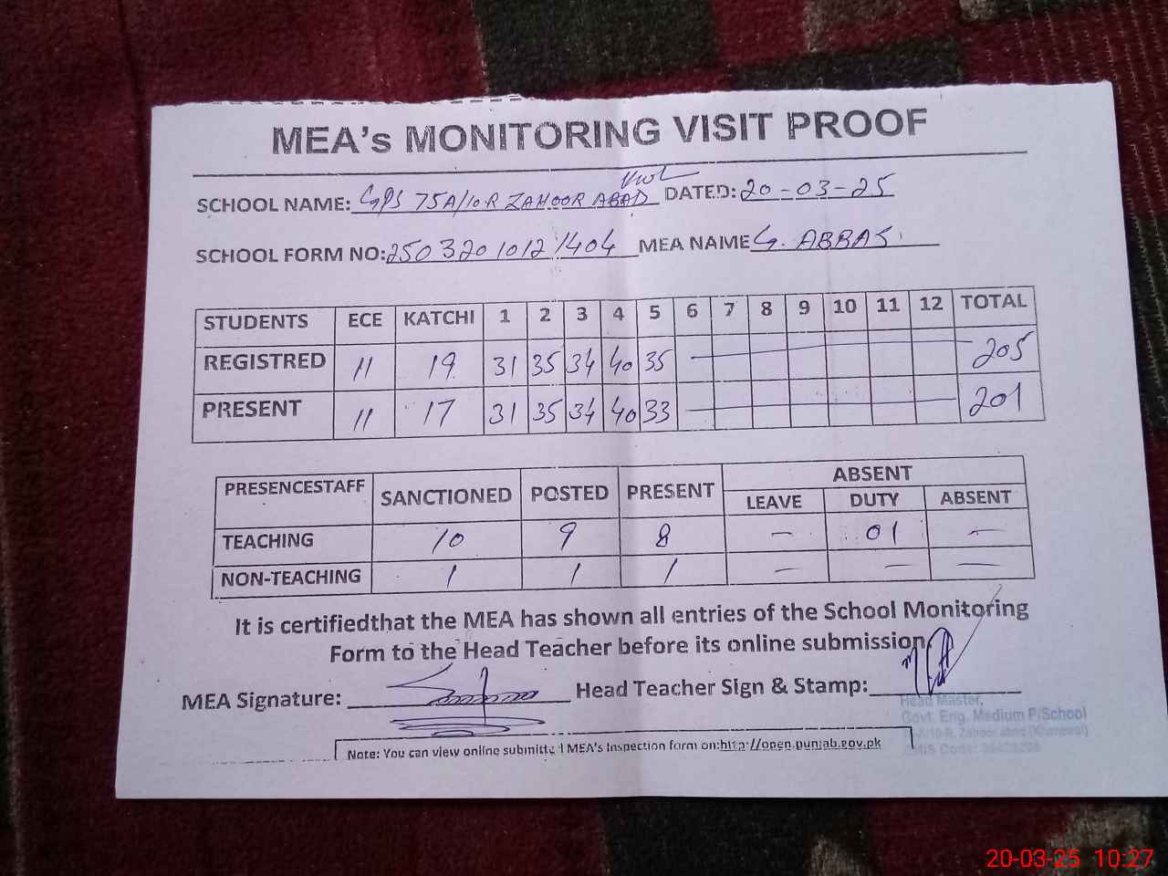 | EMIS Code: 36420208 | Name of School: GPS 75-A/10-R ZAHOOR ABAD, KHANEWAL | |||
