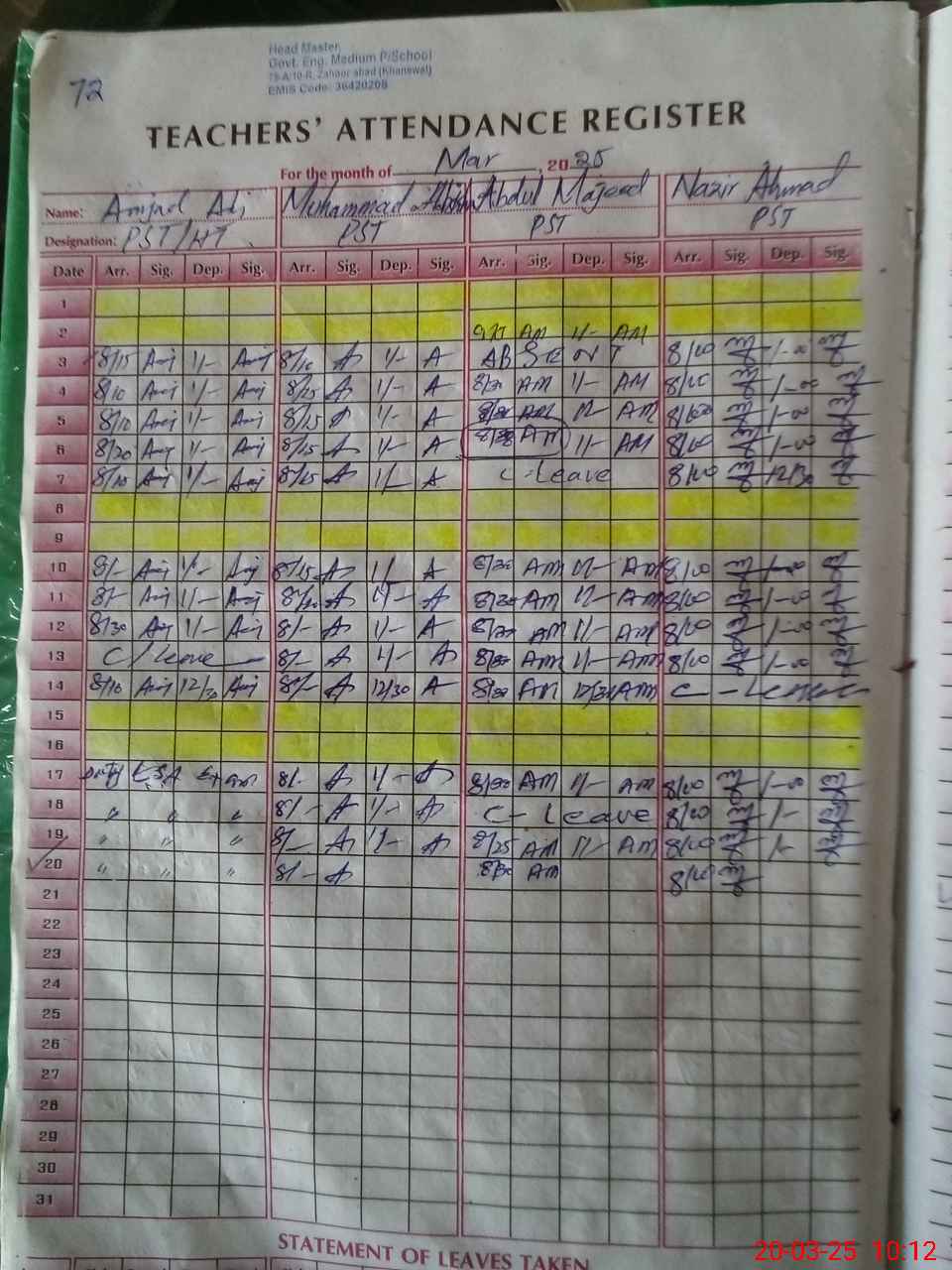 | Name: AM**** AL**** Designation: (School Headmaster's/Headmistress's) PST Phone/Cell Number: 03**** |