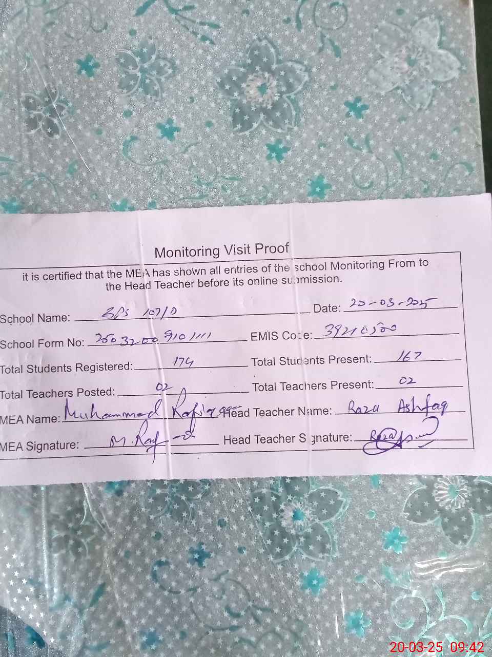 | Attendance Register | Head Teacher | MEA with School | Visit Proof |