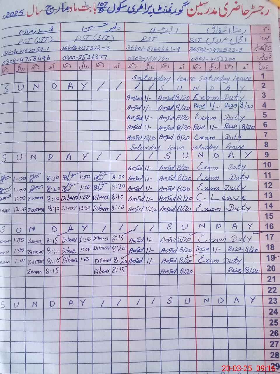 | CNIC | Full Name | Designation | R/C | Absence During Last Calender Month |