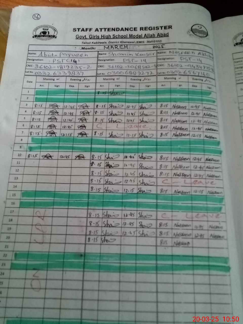 | CNIC | Full Name | Designation | R/C | Absence During Last Calender Month |