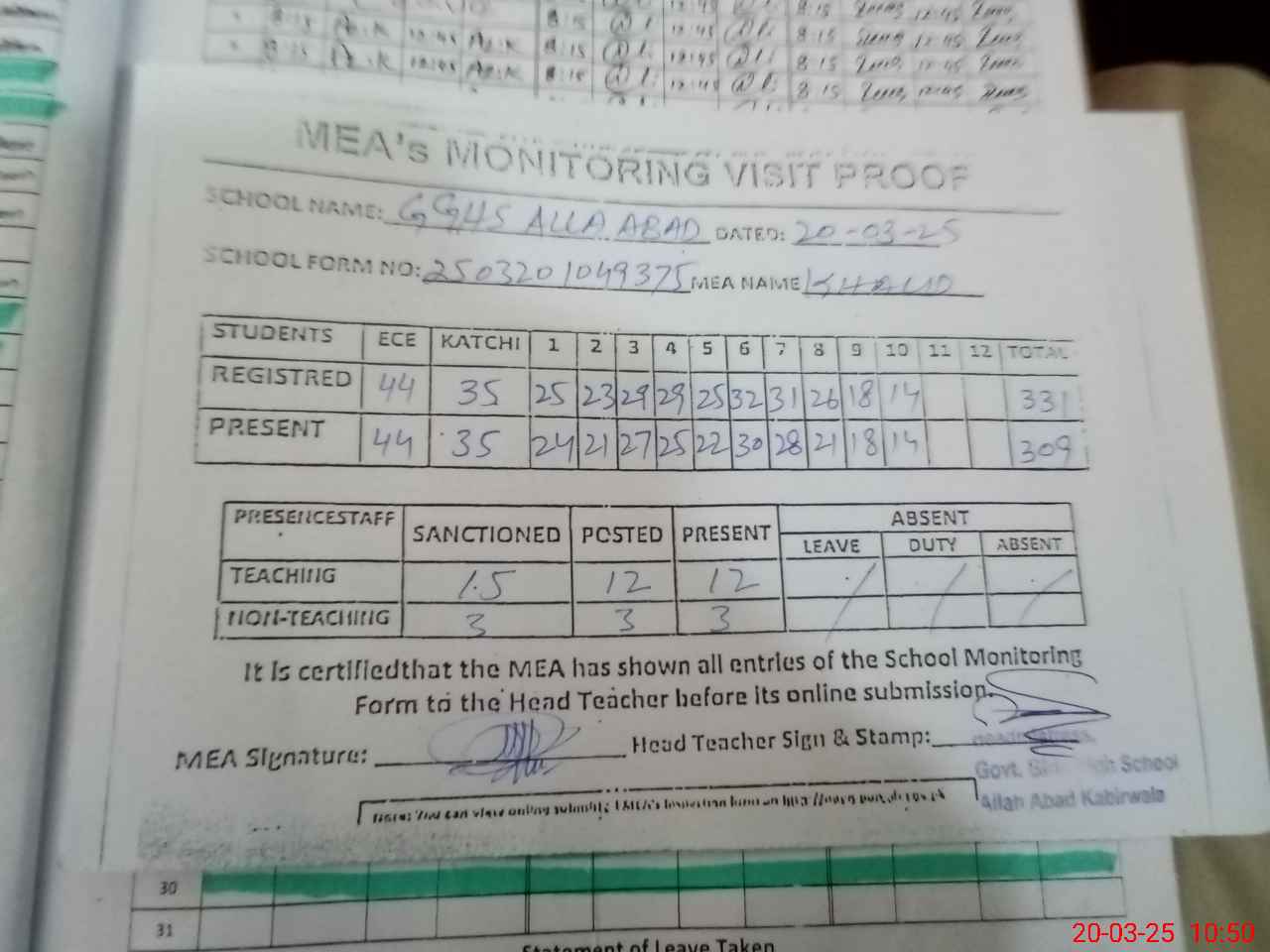 | Attendance Register | Head Teacher | MEA with School | Visit Proof |