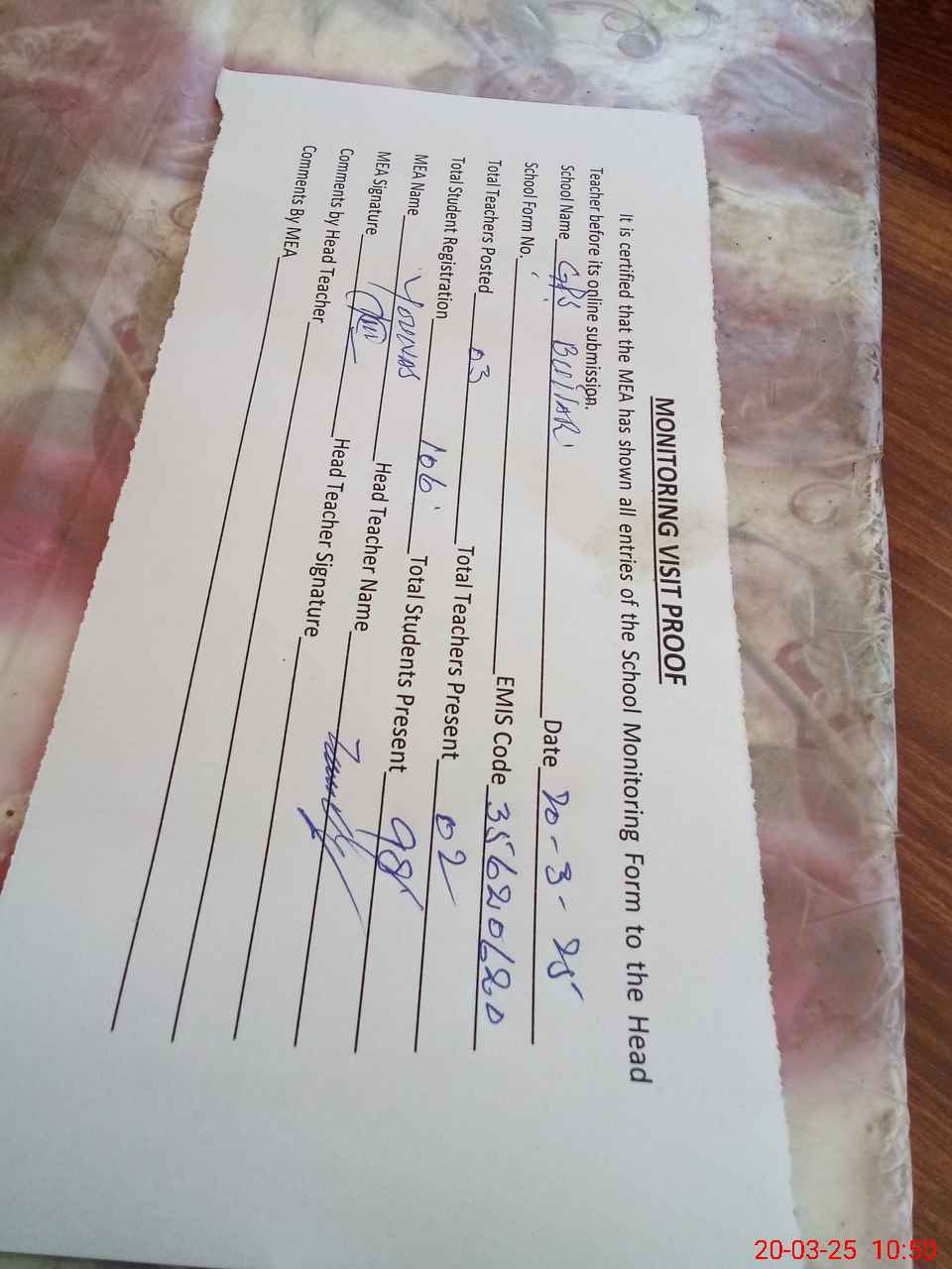 | Attendance Register | Head Teacher | MEA with School | Visit Proof |