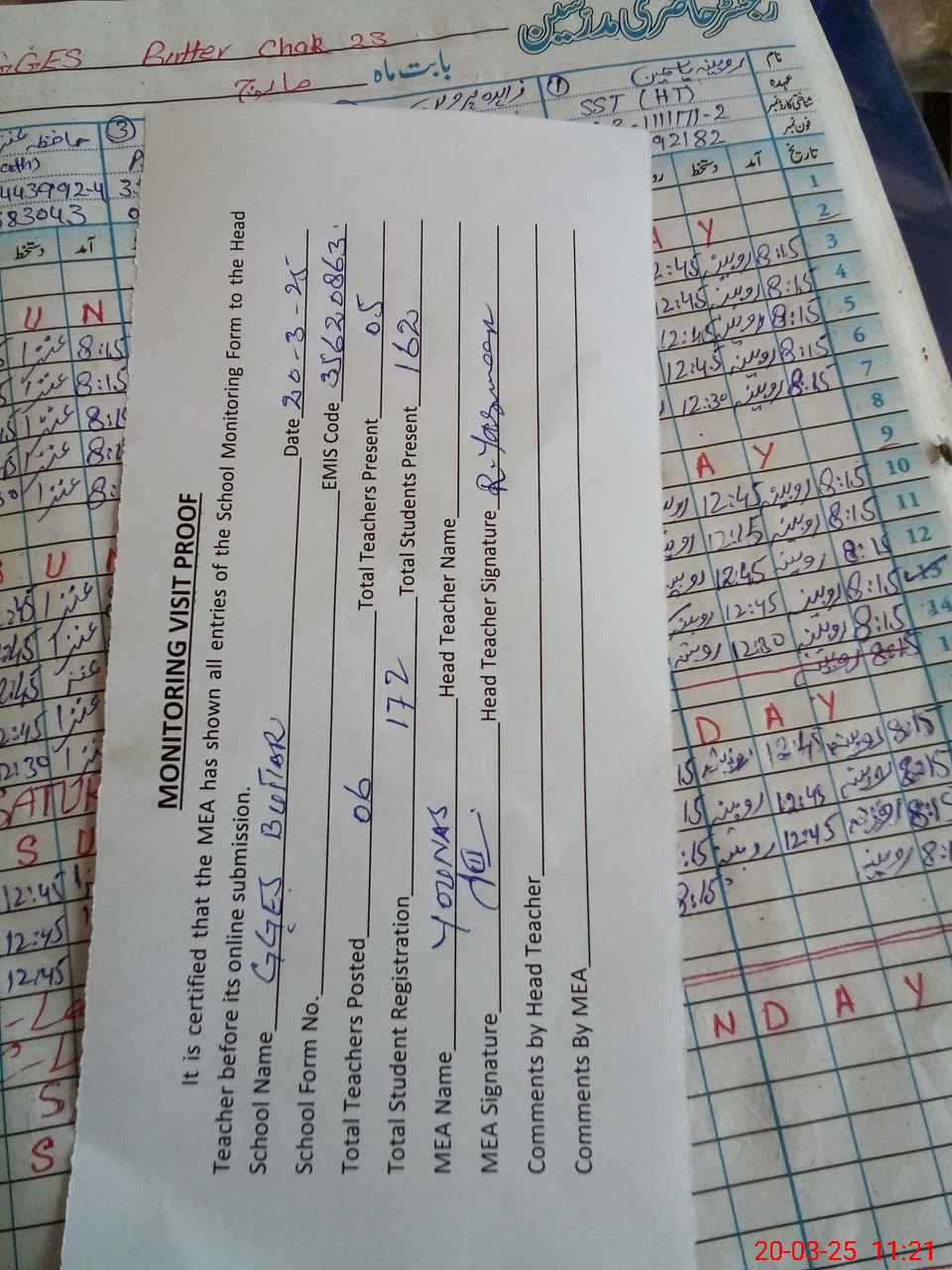 | Attendance Register | Head Teacher | MEA with School | Visit Proof |