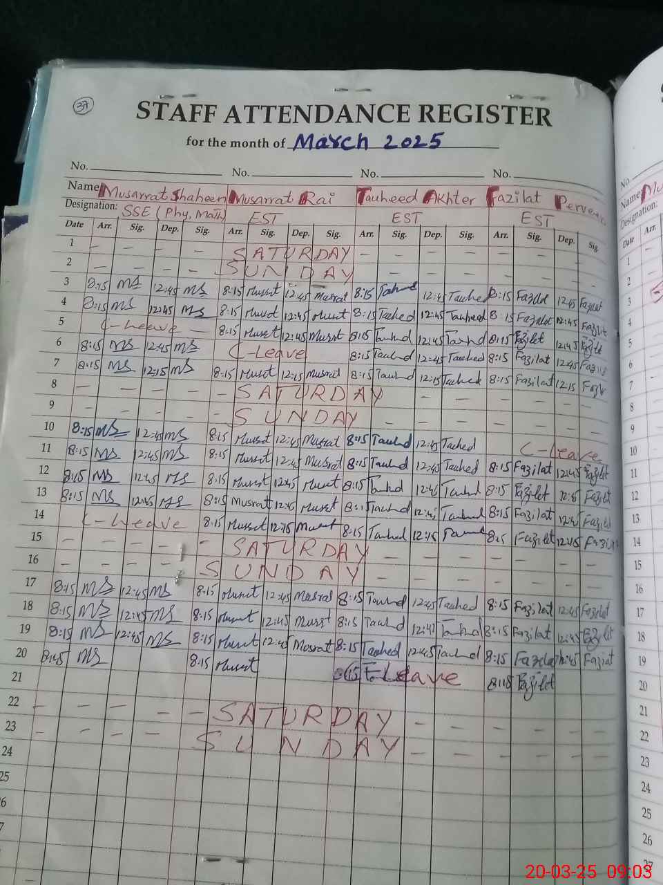 | No. of Students Present - Female | 0 | 0 | 31 | 30 | 16 | 12 | 10 | 12 | 15 | 12 | 11 | 149 | ||||