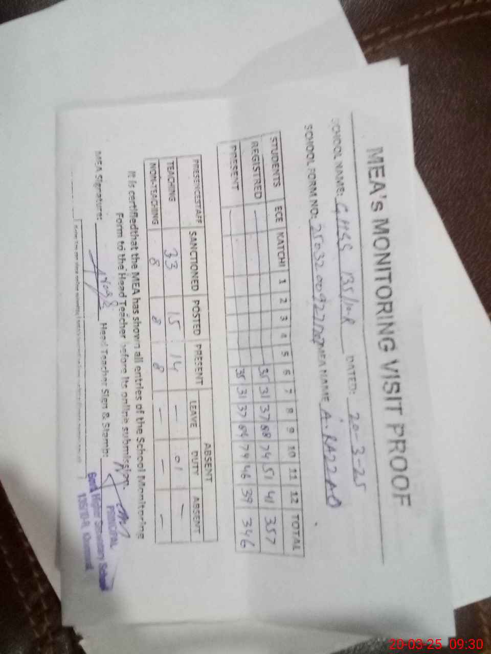 | Attendance Register | Head Teacher | MEA with School | Visit Proof |