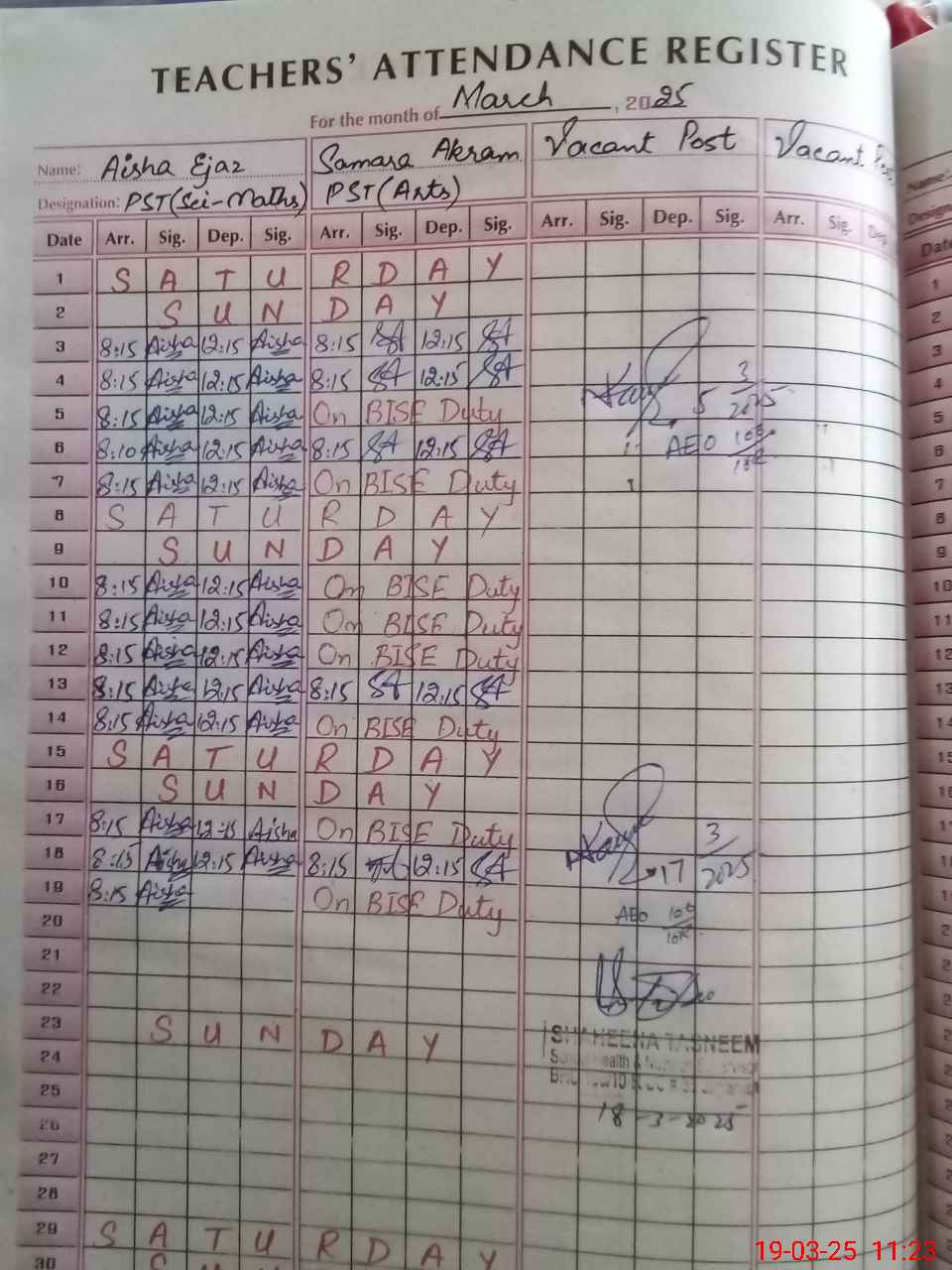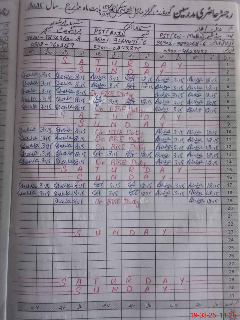 | 36**** | Sa**** Ak**** | 1 | 1 | 0 | 0 | 0 | 0 | 0 | 0 | 0 | 0 | 0 | Exam Duty |