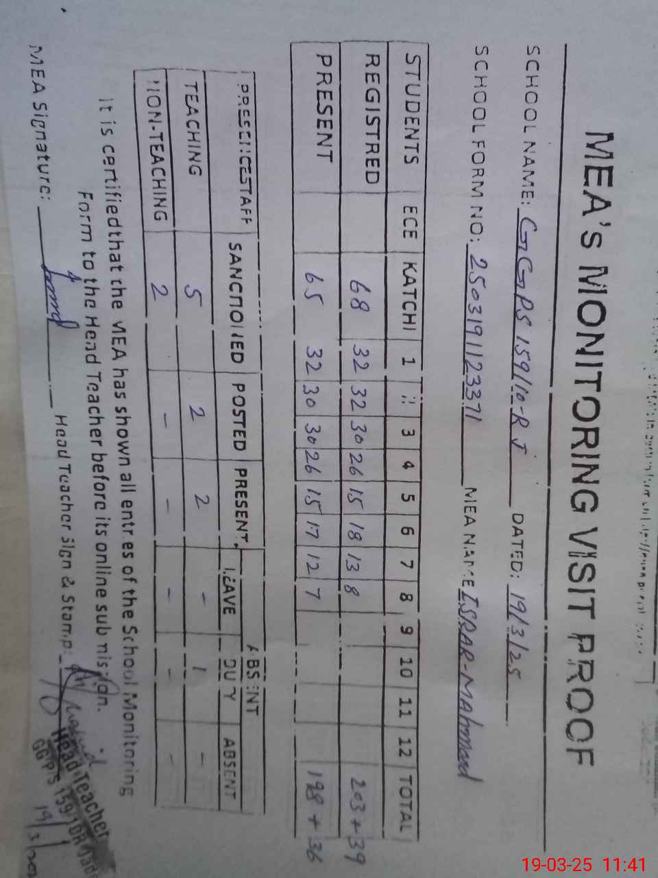 | Attendance Register | Head Teacher | MEA with School | Visit Proof |