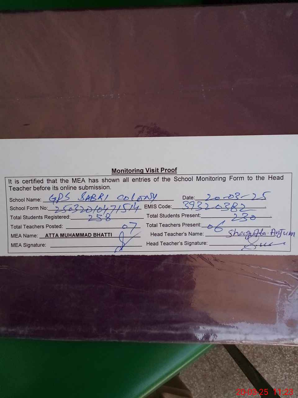| EMIS Code: 39320382 | Name of School: GPS SABRI COLONY | |||