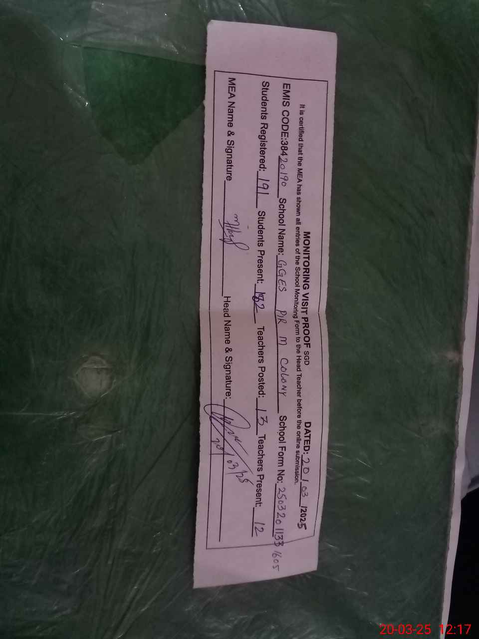 | Attendance Register | Head Teacher | MEA with School | Visit Proof |