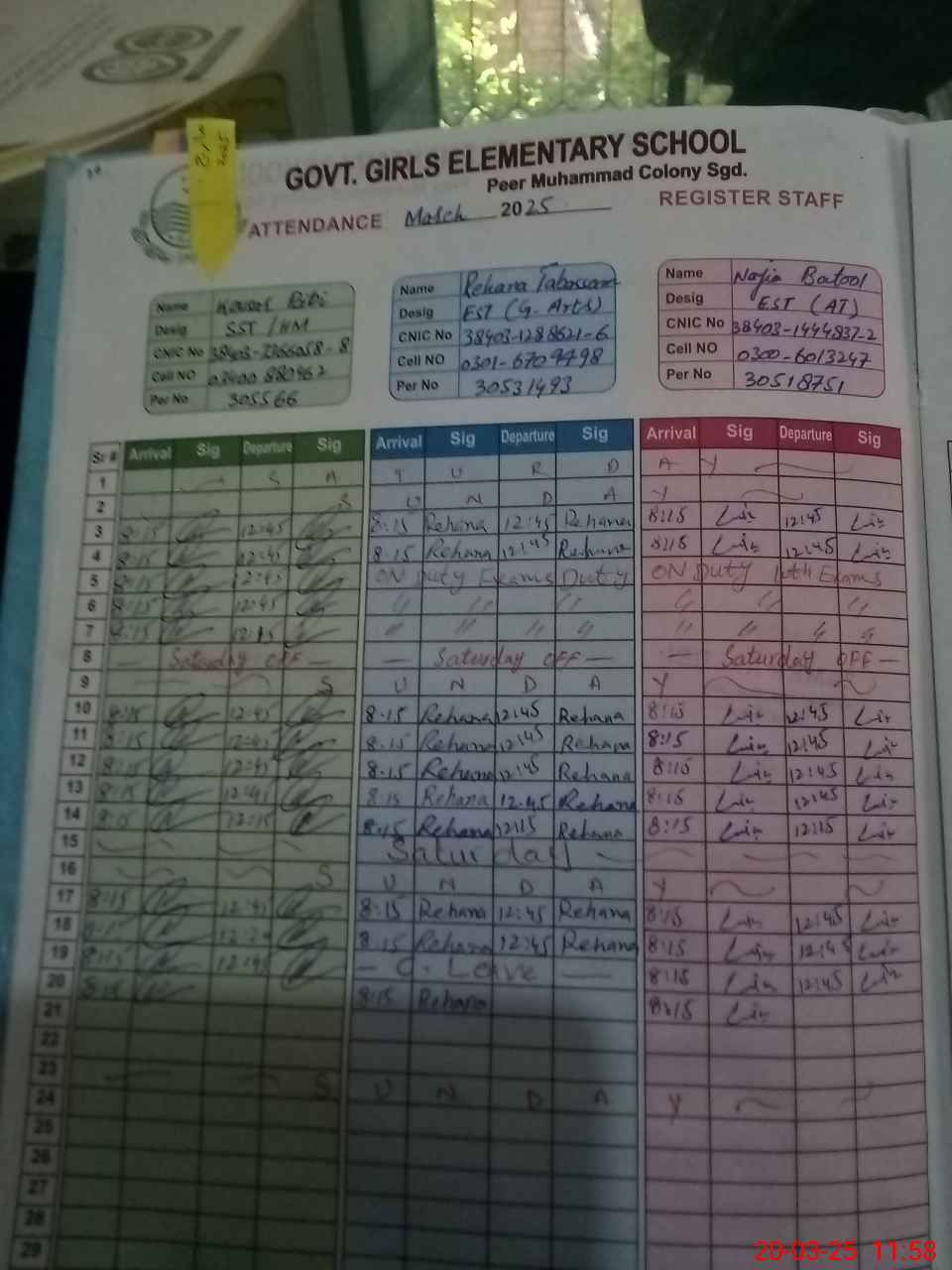 | CNIC | Full Name | Designation | R/C | Absence during last cal. month |