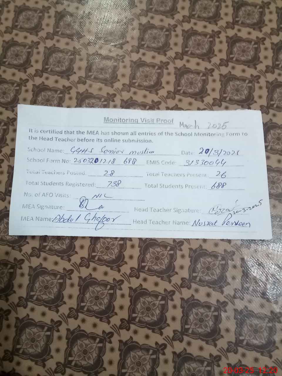 | Attendance Register | Head Teacher | MEA with School | Visit Proof |