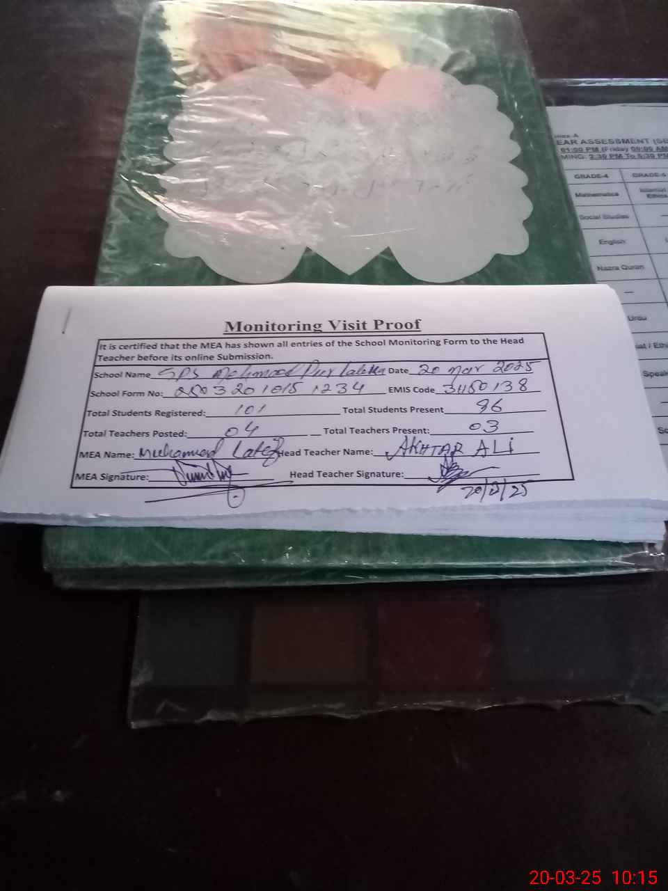 | Attendance Register | Head Teacher | MEA with School | Visit Proof |